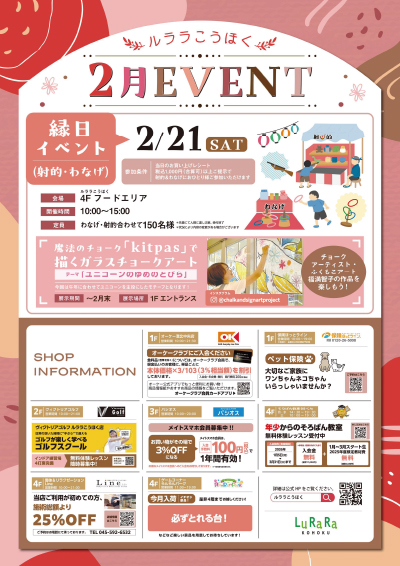 ルララこうほくの2月館内イベント&各店舗キャンペーン情報をご案内いたします。